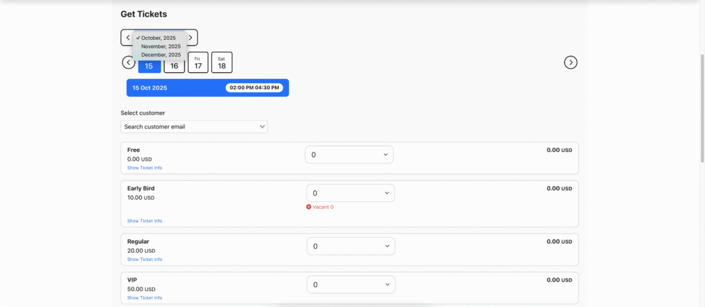 In the Event Schedules, if all tickets for a specific timeslot/date are booked, that timeslot will display as Sold Out.