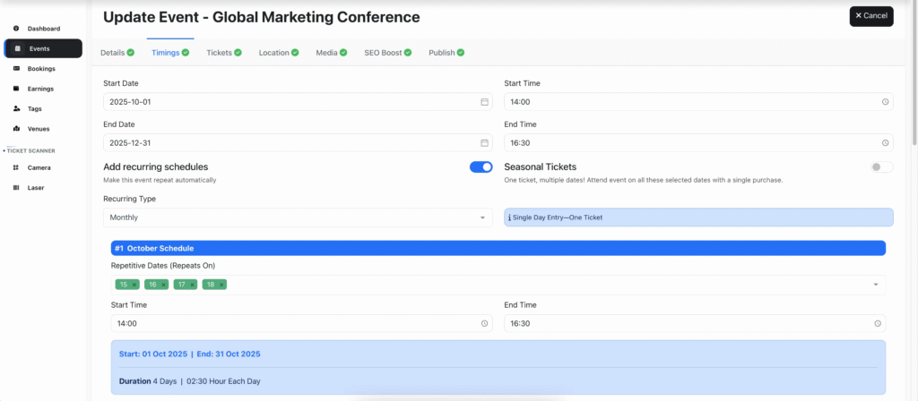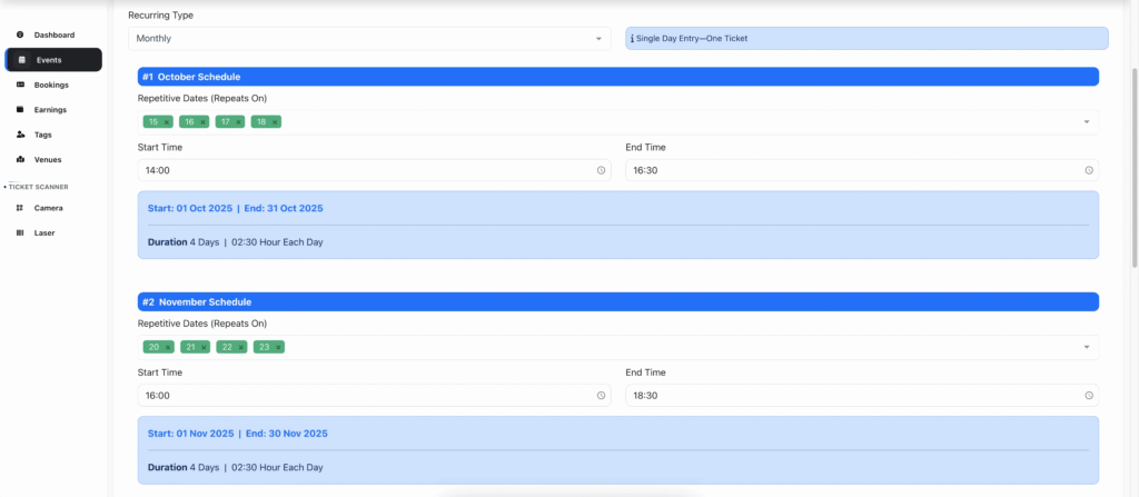 - Set Ticket Price: Price covers all sessions in the selected period.