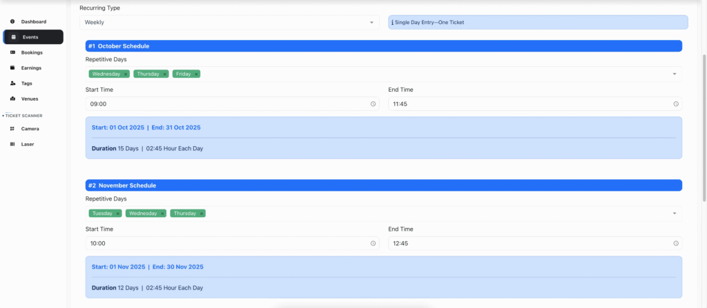 - Seasonal Tickets: Enable full-period payments for monthly or weekly schedules. In case of Seasonal Tickets, you can set a ticket price for the entire period. Then the customer will pay for the entire period at once. And customer will be able to checkin for all the sessions/days with the same ticket. The Ticket scanner will create seperate check-in entries for each session/day.